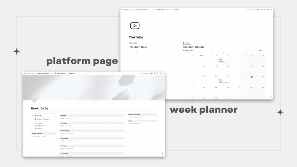 - And finally, a Weekly Planner — where you can set your Top Priorities for the week, take Notes, Brain Dump ideas and plan for the Week ahead.